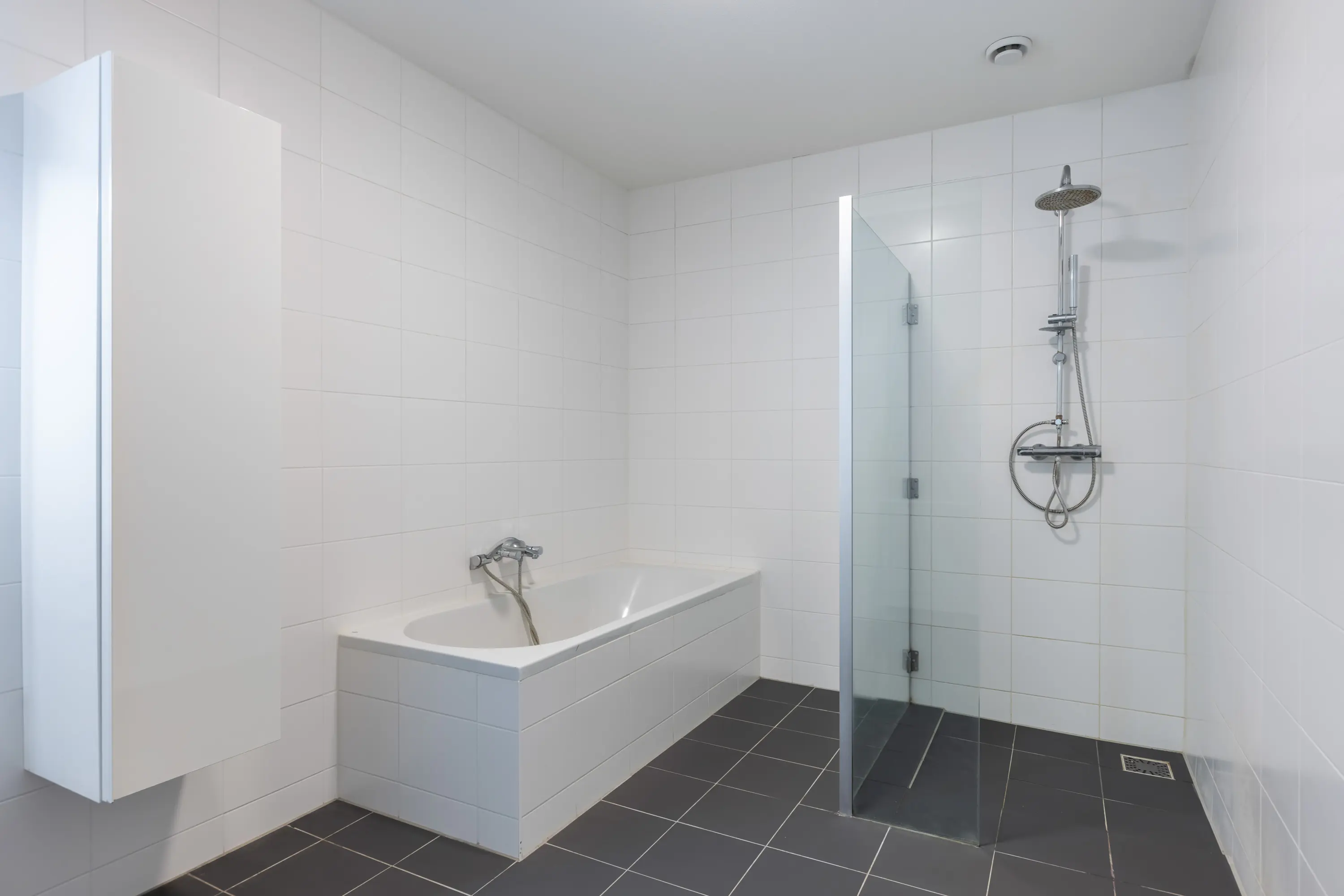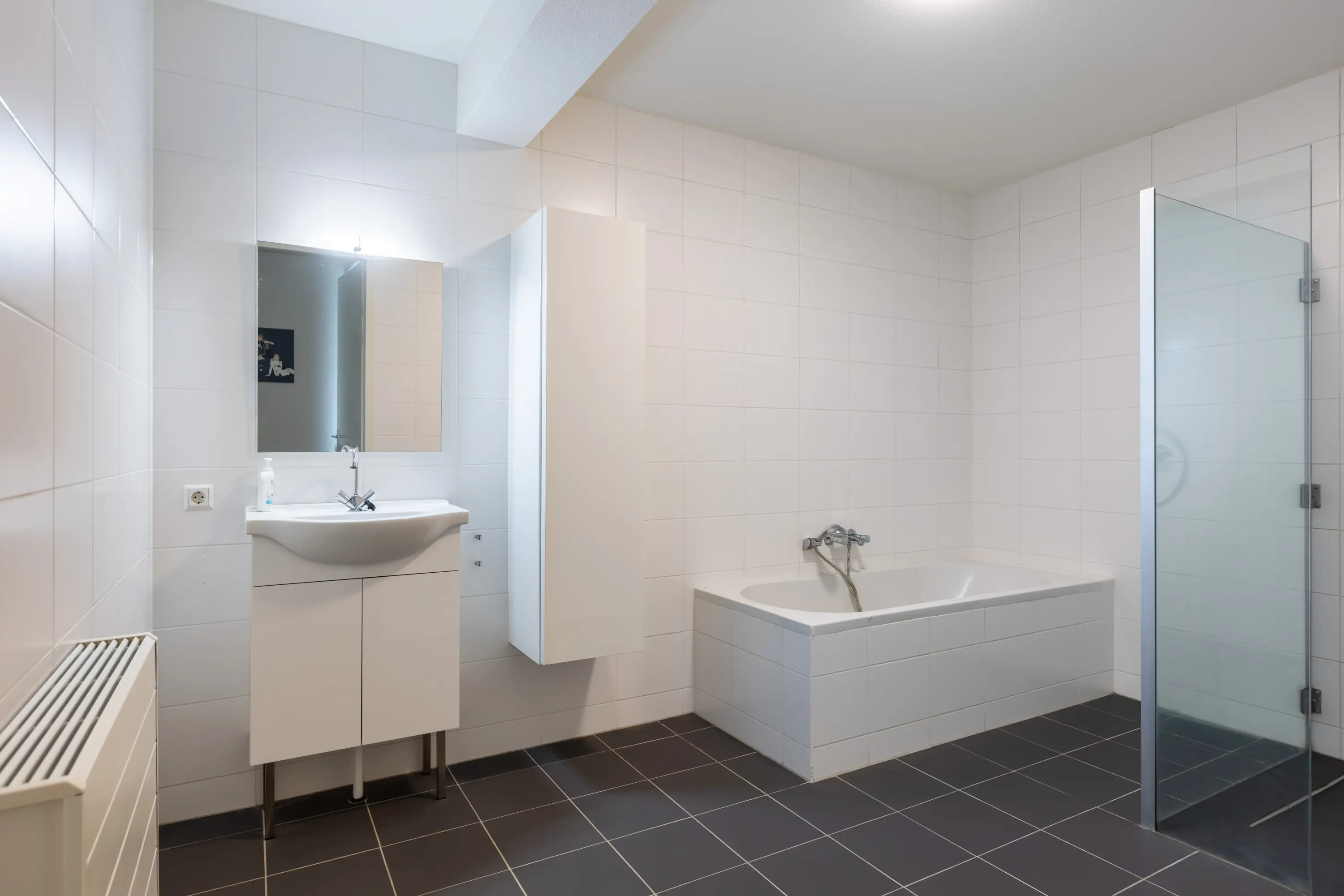 De volledig betegelde badkamer beschikt over een inloopdouche, ligbad en wastafelmeubel.