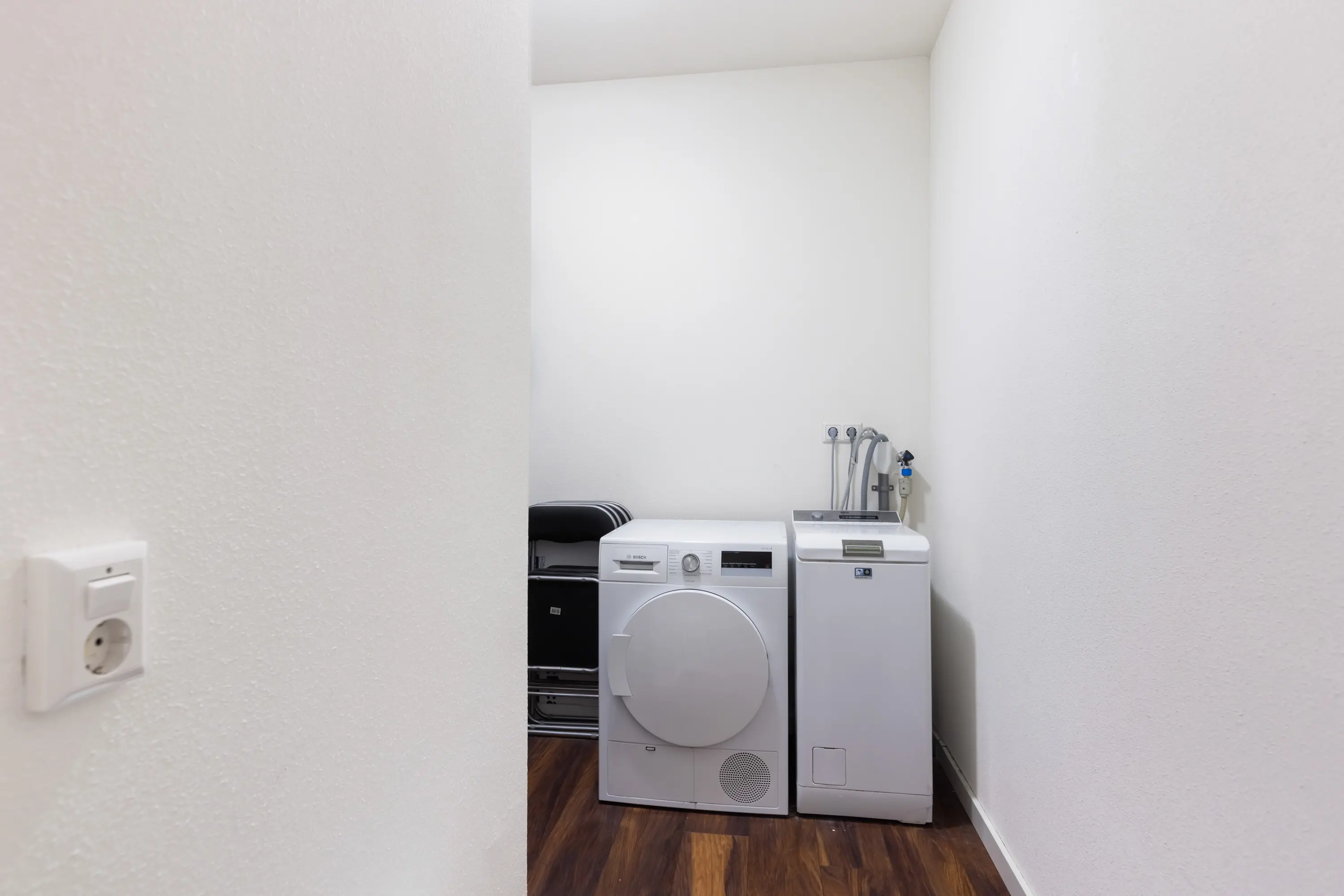 U komt binnen in een ruime hal met toegang tot de meterkast, toilet, cv-kast en een praktische berging met aansluitingen voor wasmachine en droger.