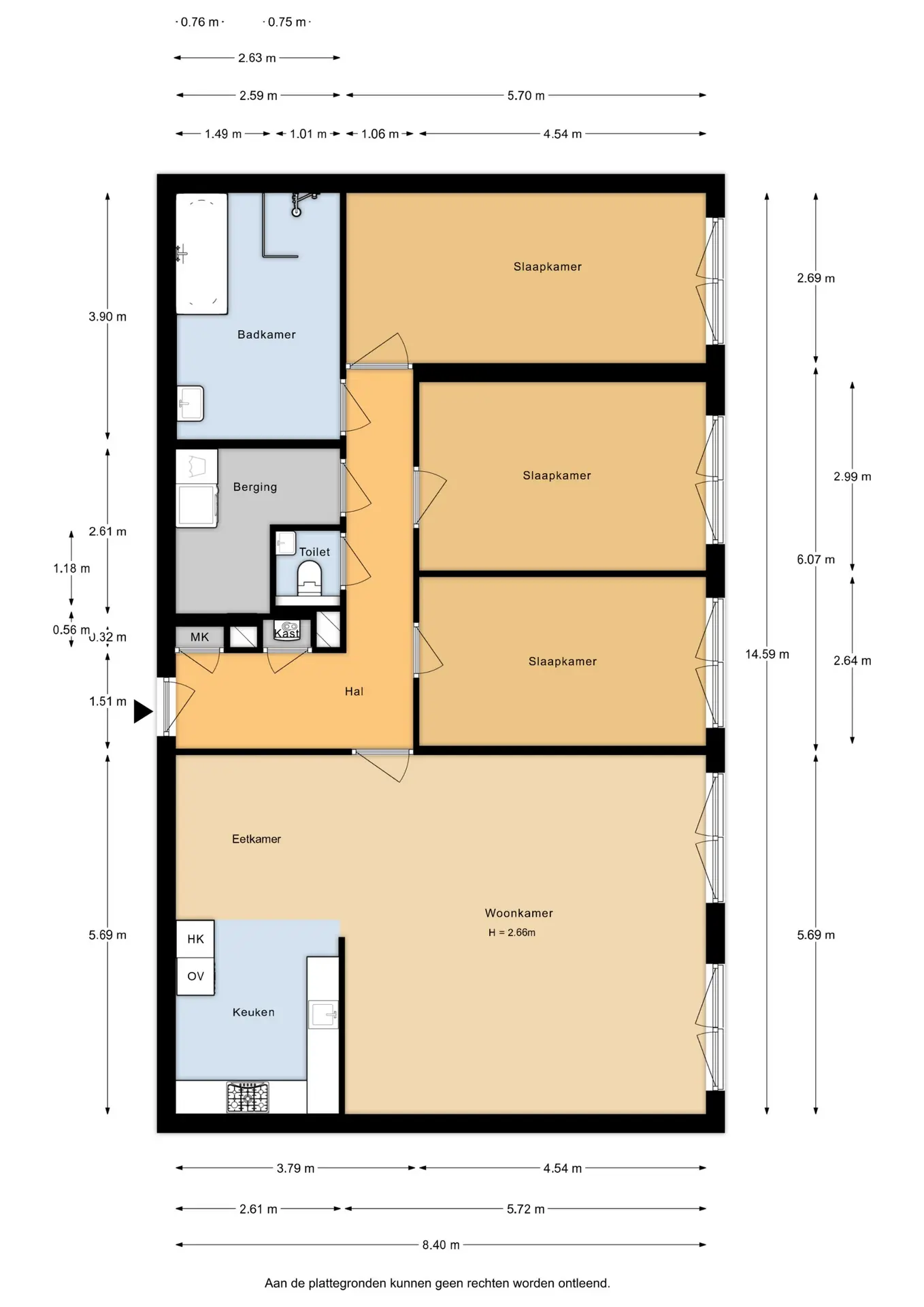 Vanuit de hal bereikt u de woonkamer, badkamer en drie slaapkamers.