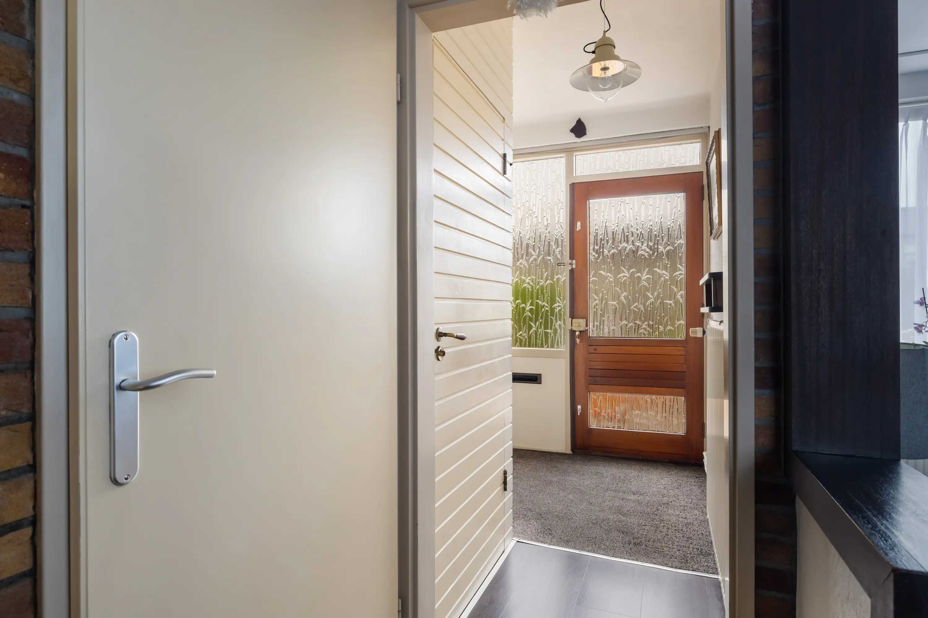 Entree, hal met meterkast en toilet. Ruime, lichte doorzonwoonkamer met praktische trapkast en een laminaatvloer.
