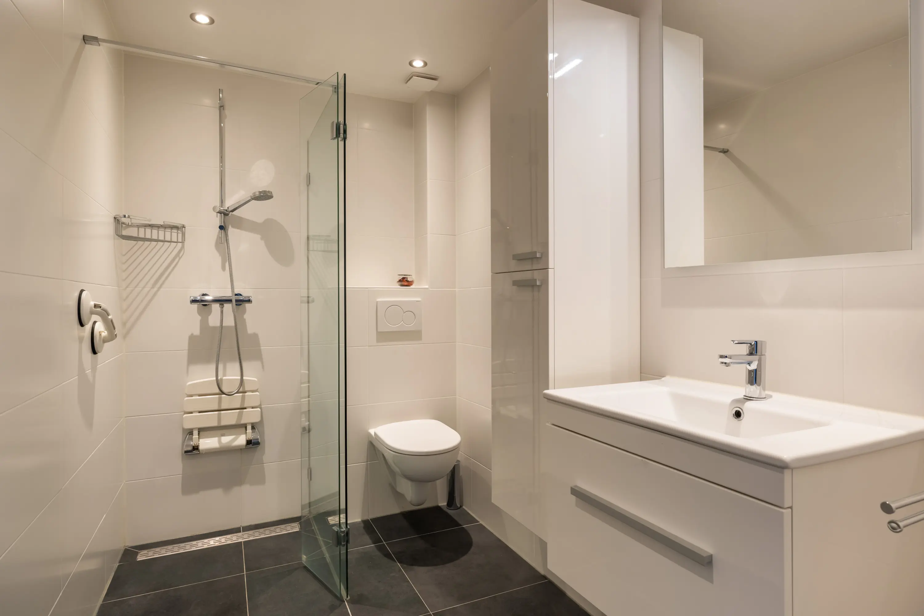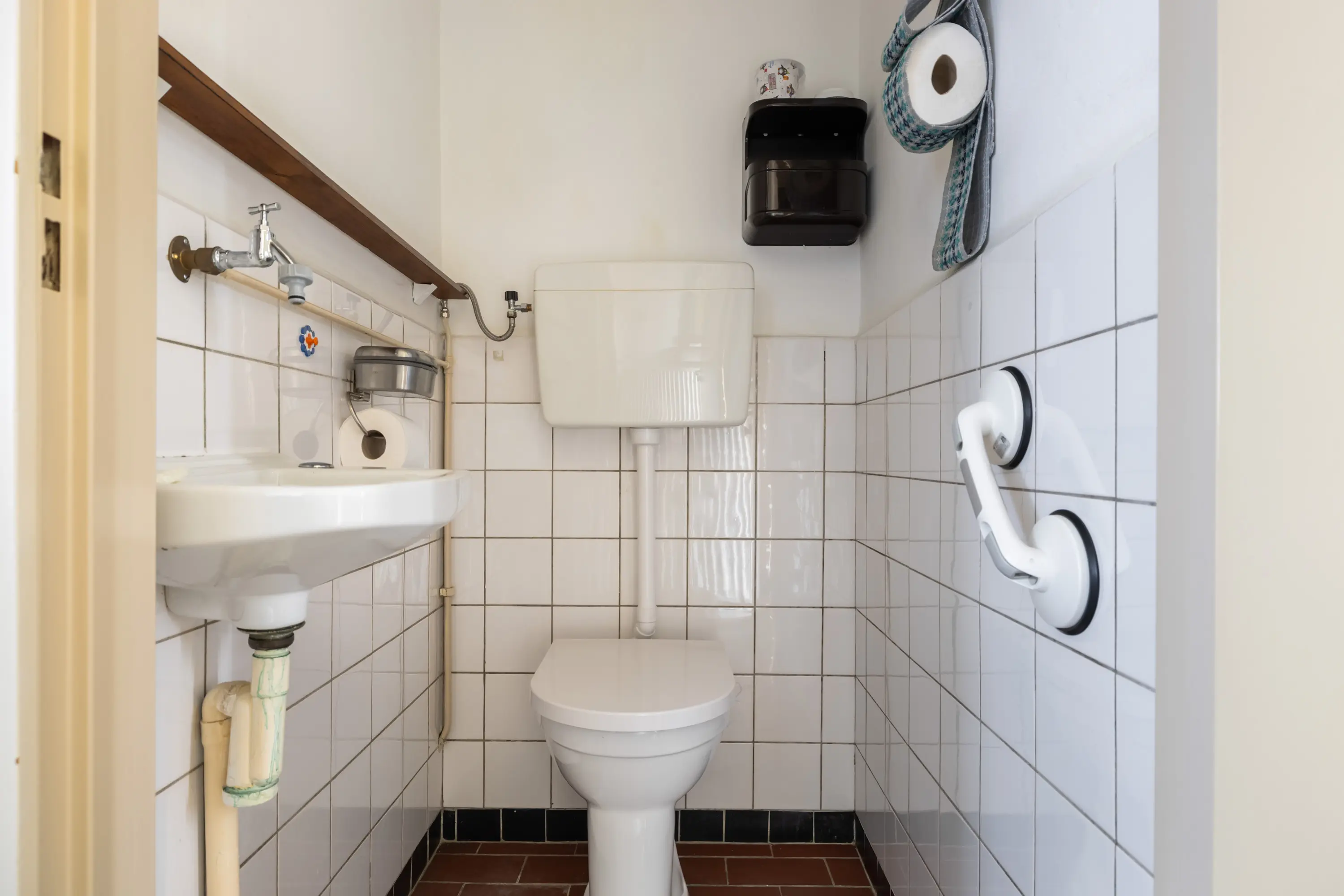 Overloop met toegang tot de volledig betegelde badkamer (tot aan het plafond), met wastafel, toilet en inloopdouche (2018).