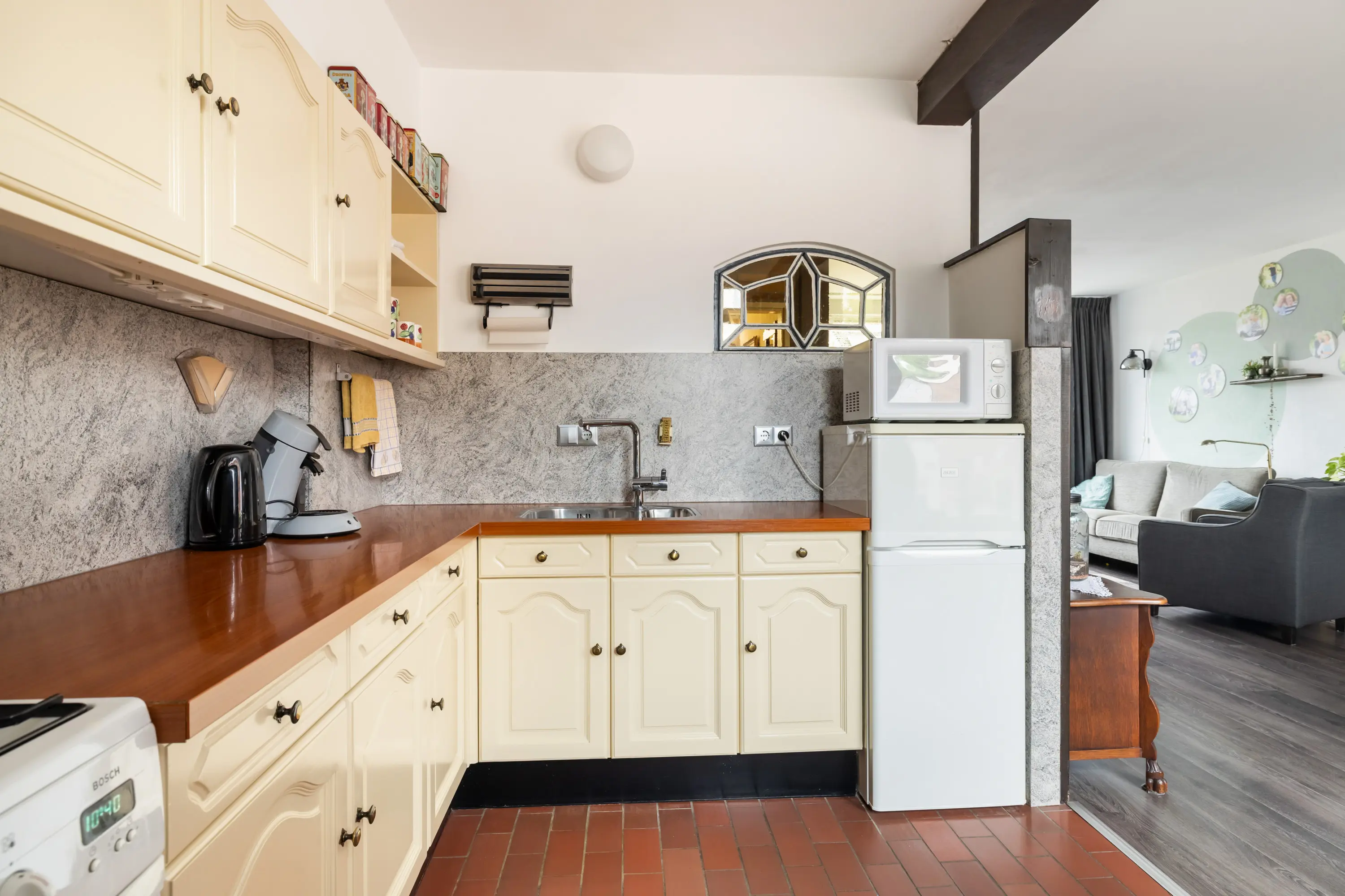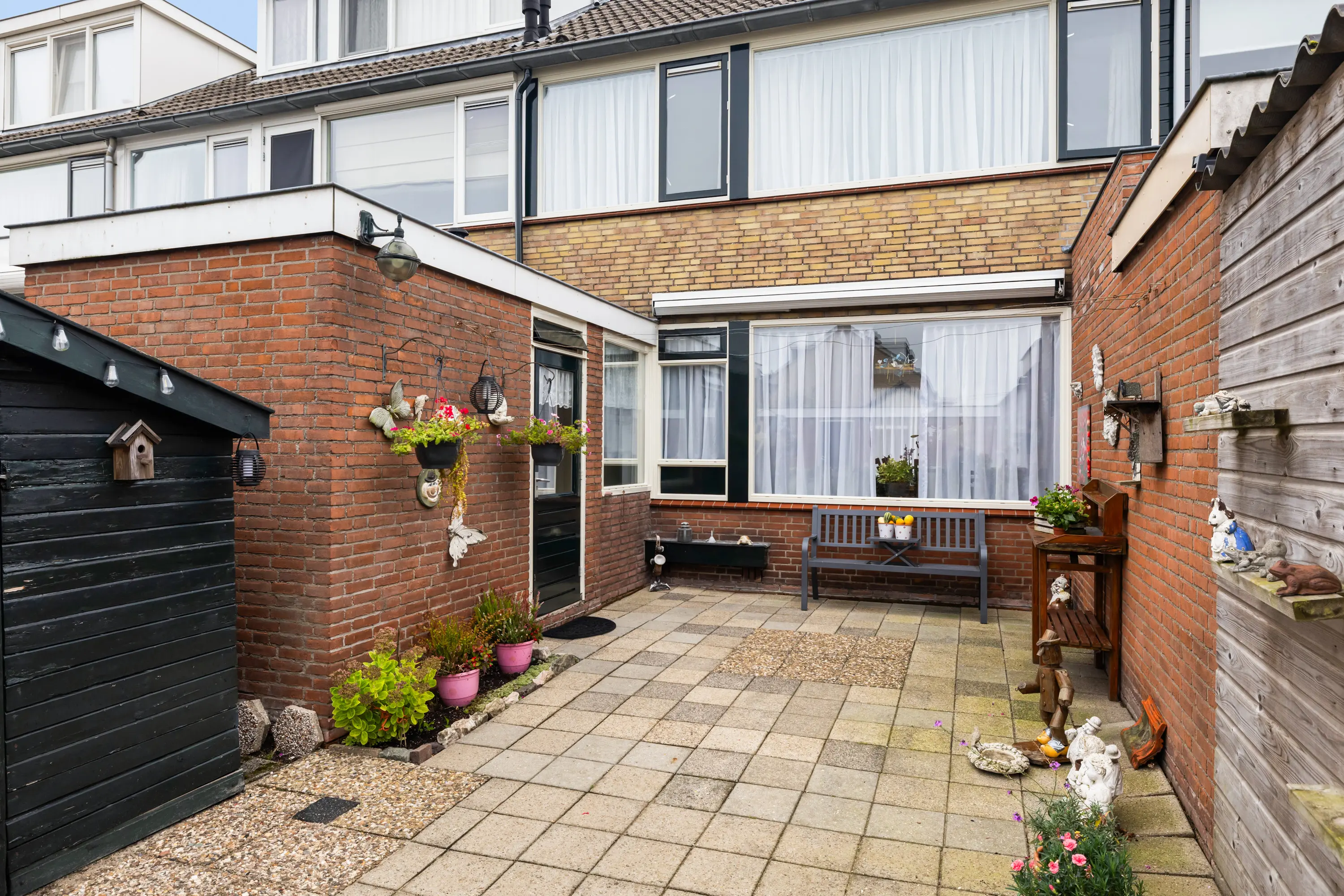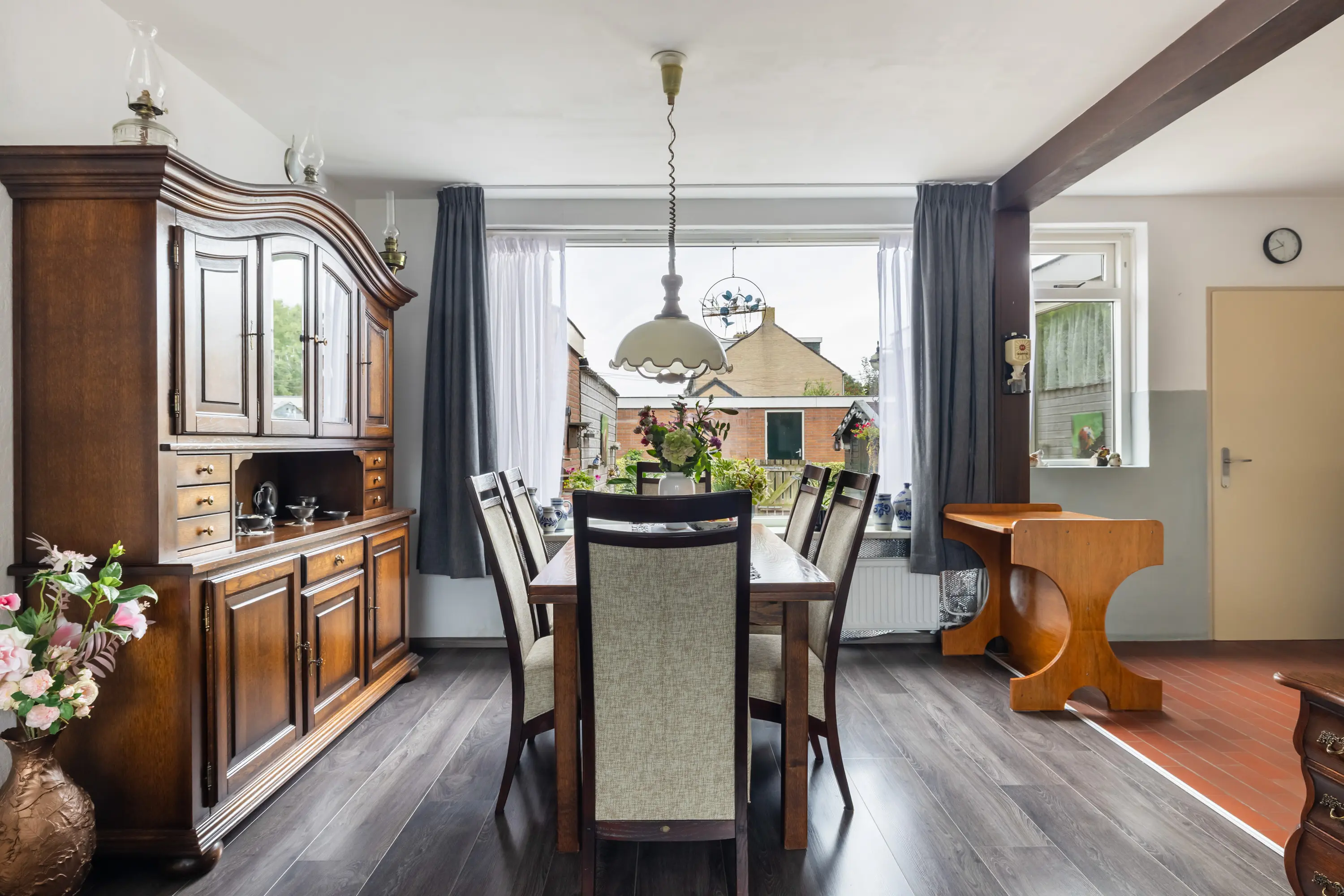 Aan de achterzijde bevindt zich de open keuken met afzuigkap en de toegang tot de berging. Via de berging stap je zo de zonnige achtertuin in, voorzien van een achterom.