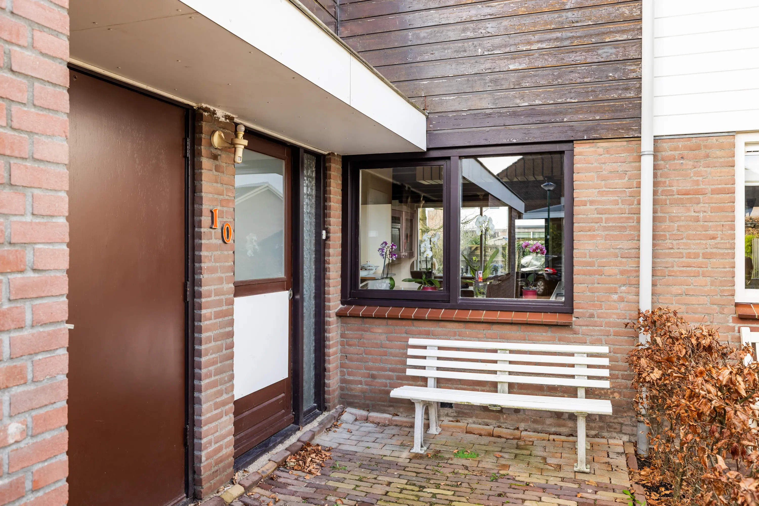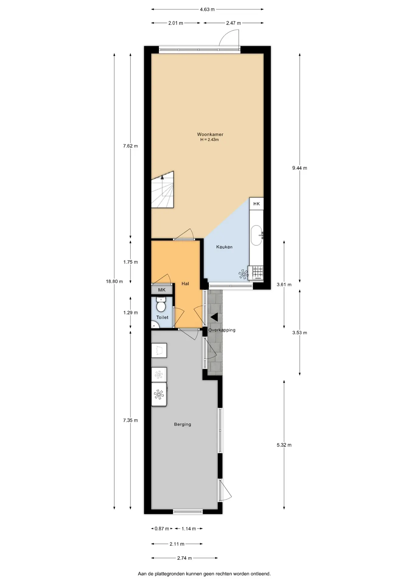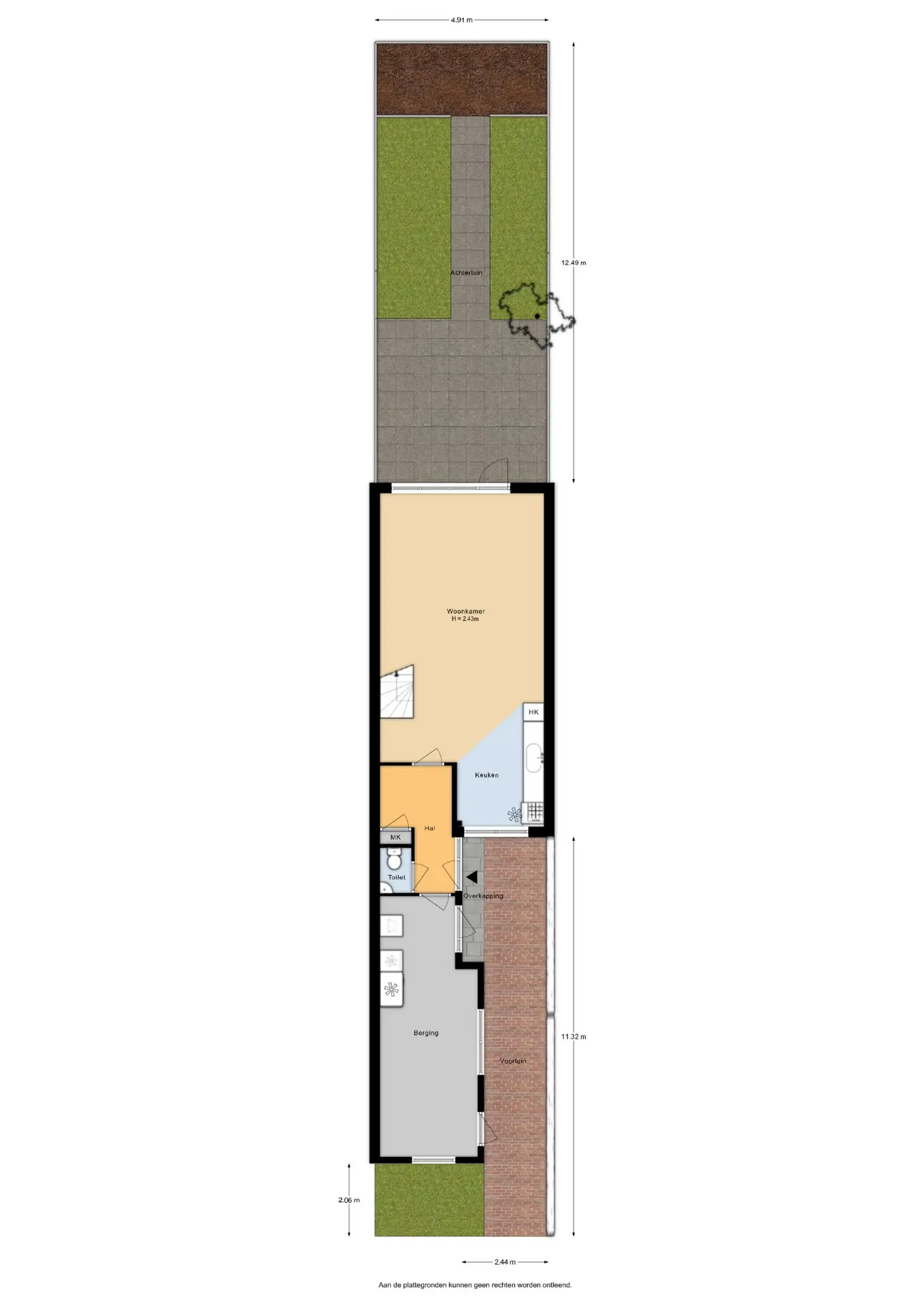 Via de voortuin bereikt u de entree of de inpandige berging. In de hal bevinden zich het toilet, de meterkast en toegang tot de woonkamer.