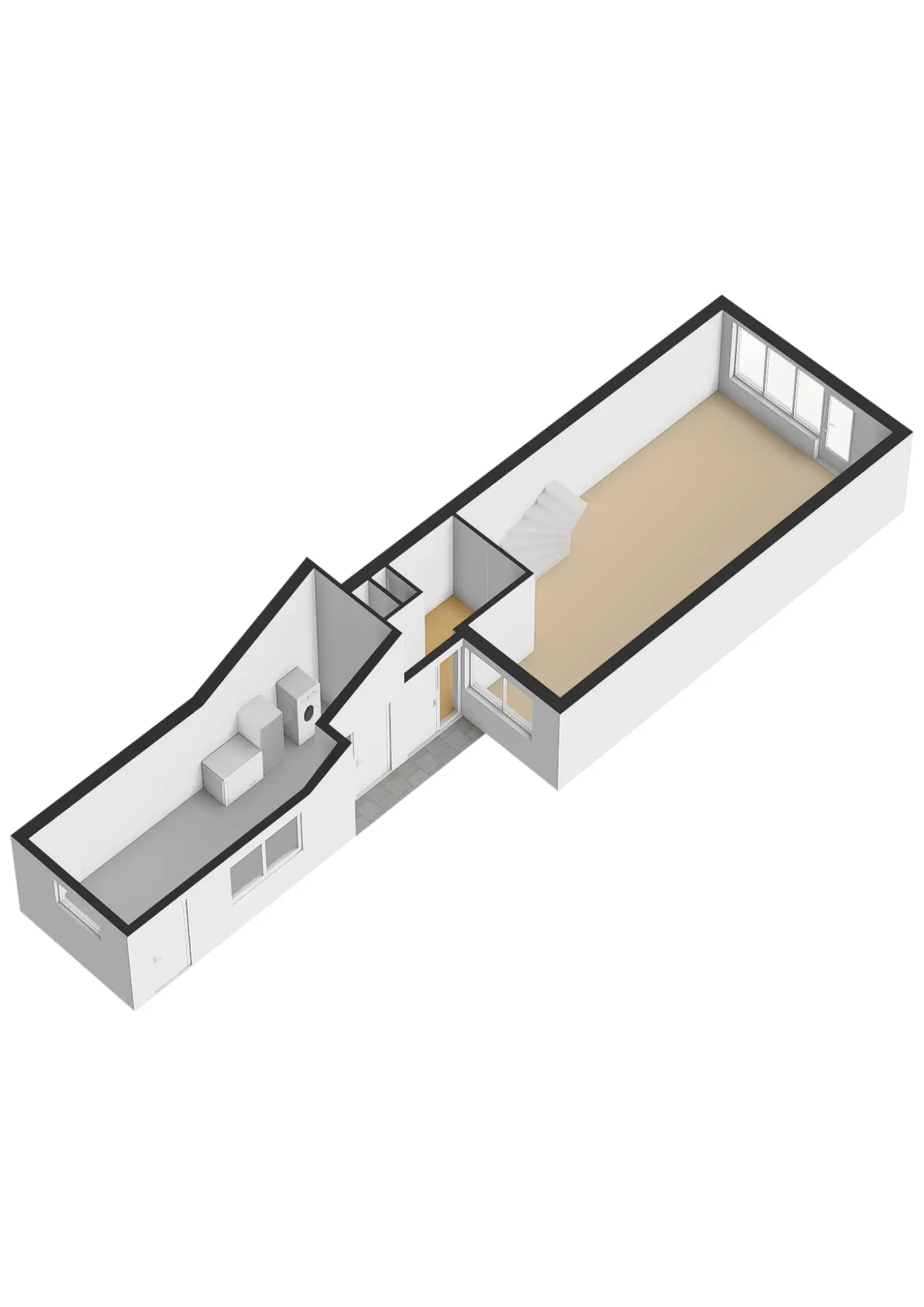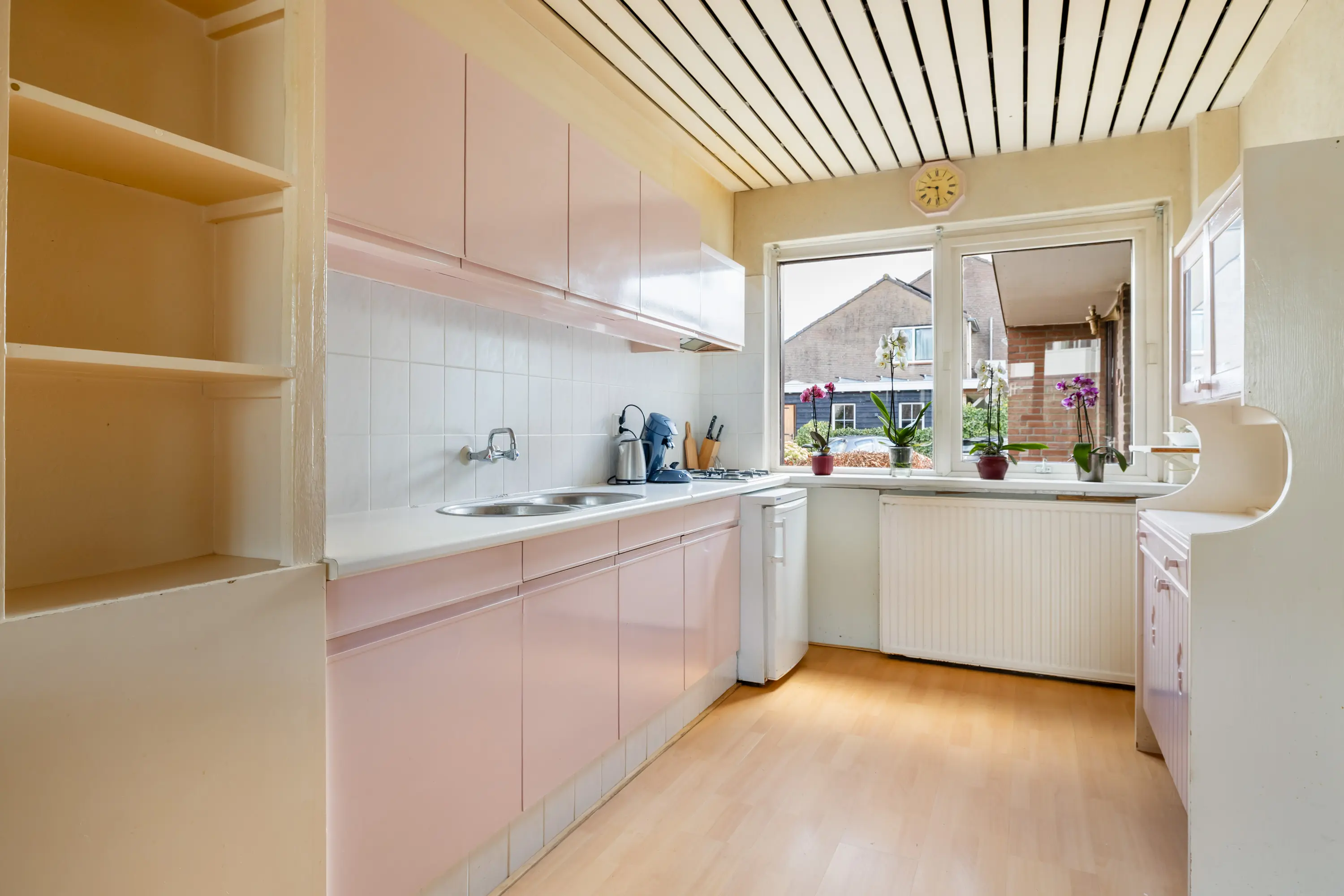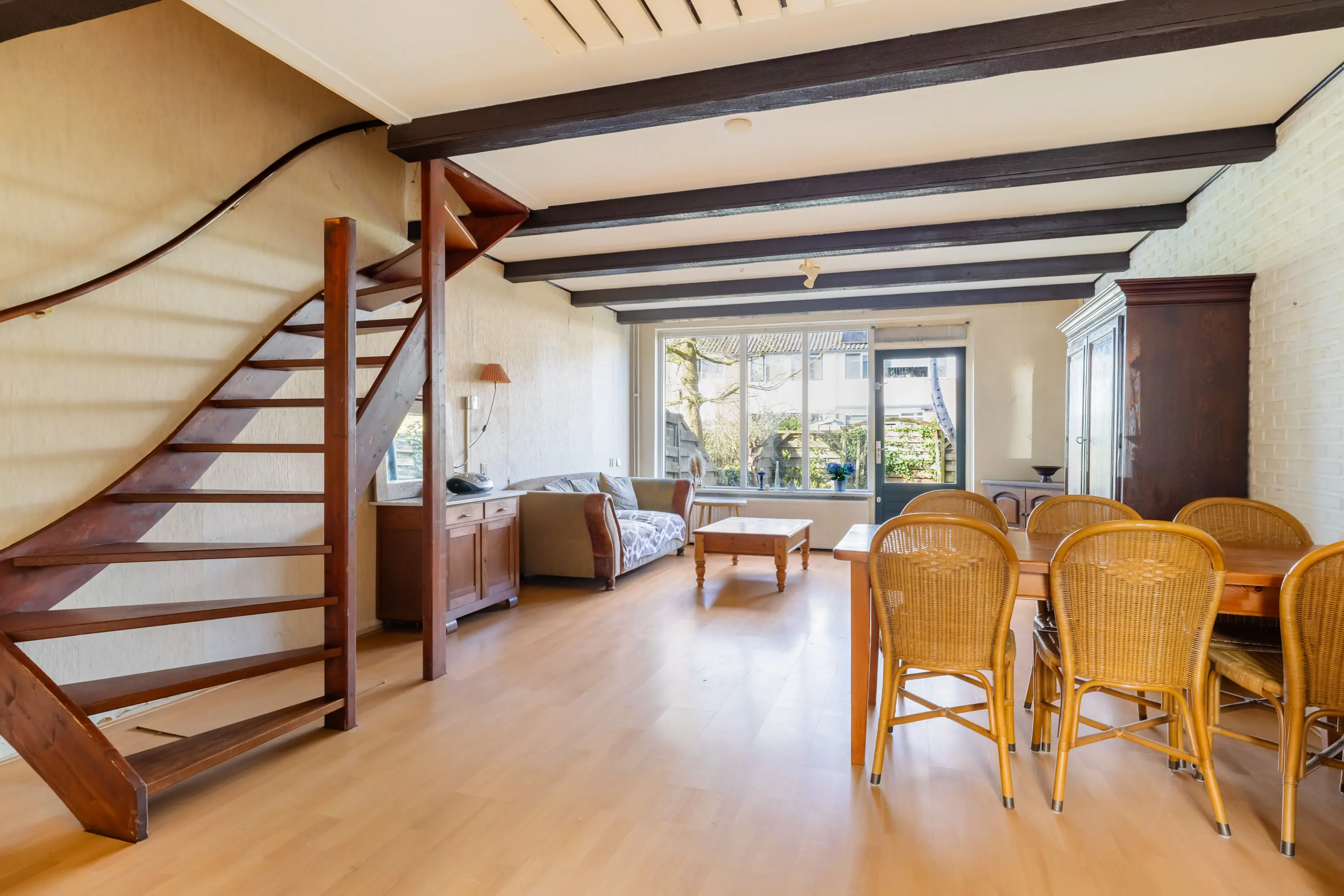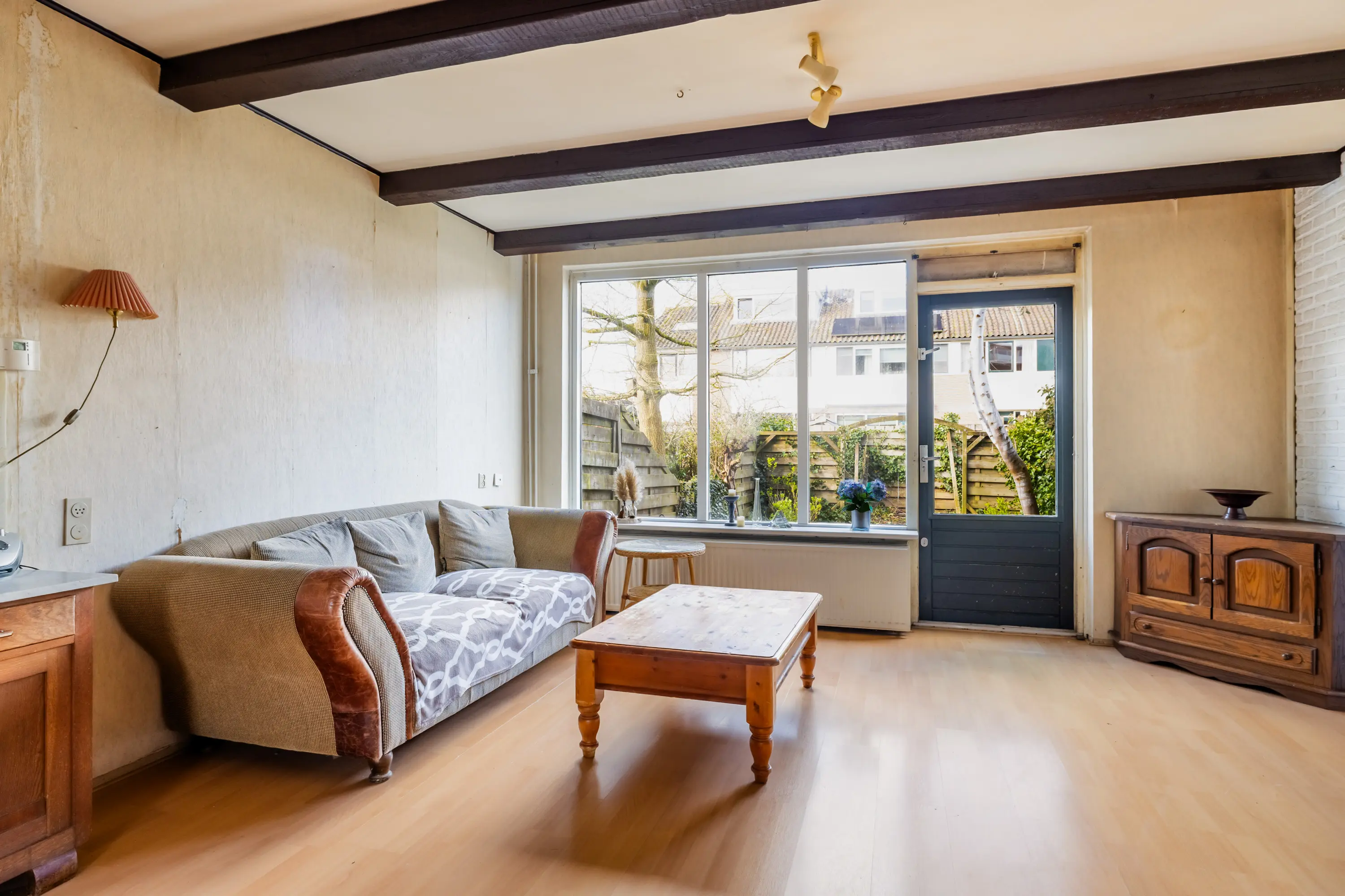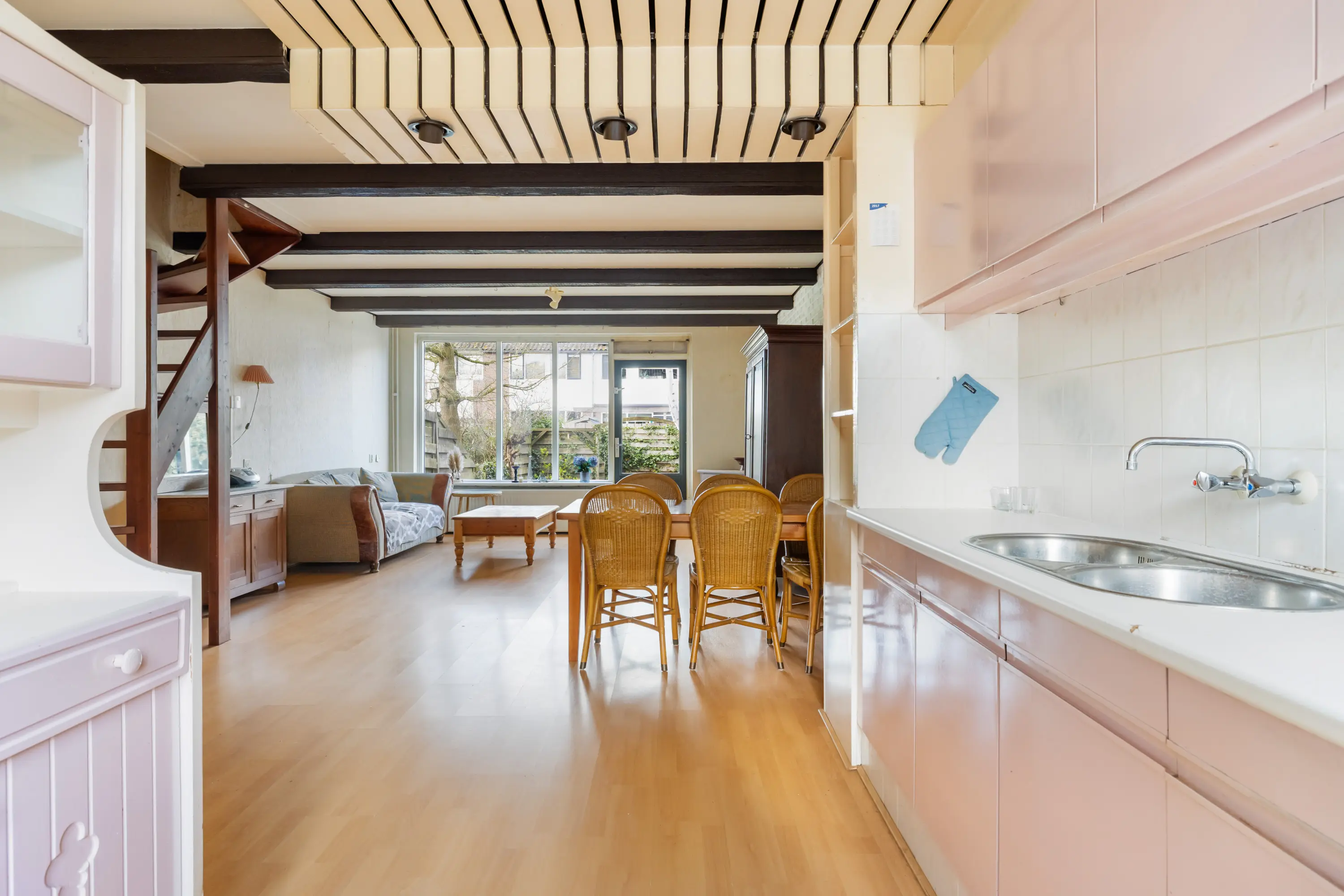 De lichte woonkamer beschikt over een laminaatvloer en een grote raampartij aan de achterzijde. Via de deur bereikt u de zonnige tuin, de open keuken bevind zich aan de voorzijde.